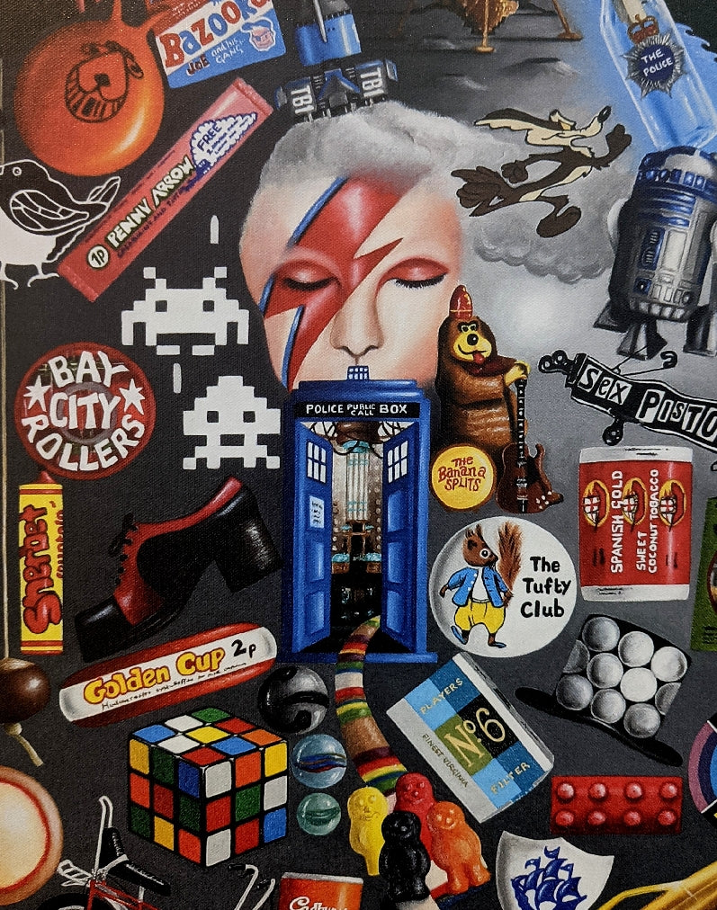 A visually striking composition from the artist's Pop-Surrealism collection with strong contrasts of light and dark, how many pop-culture references can you spot from the 70's and 80's?