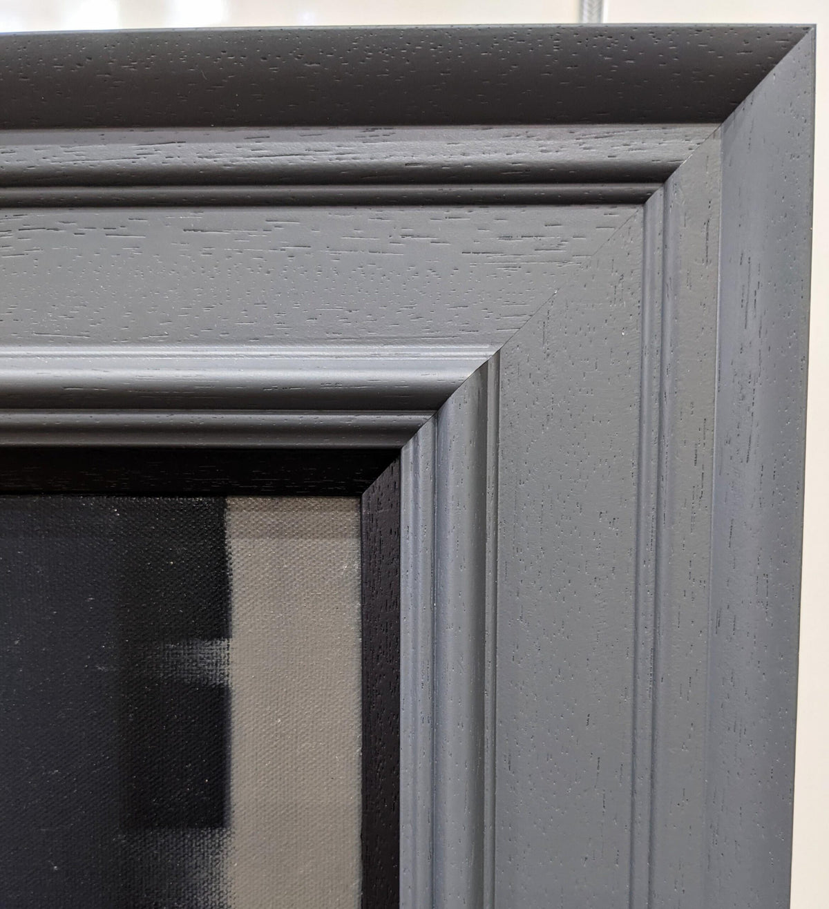 Double framed with an inner black slip and outer woodgrain mid-grey moulding.