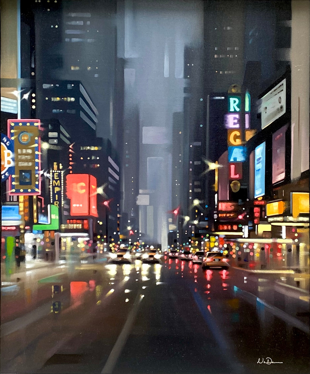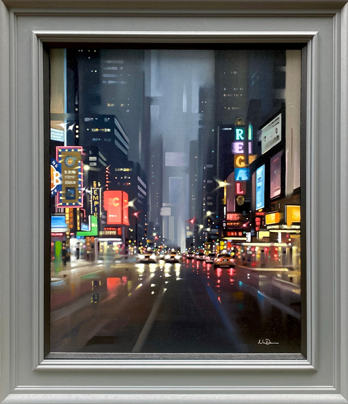 A dazzling New York street scene and demonstrating the artist's signature style of depicting the vibrancy of nighttime cityscapes focusing on the myriad of colours as the lights reflect in the road after rain.