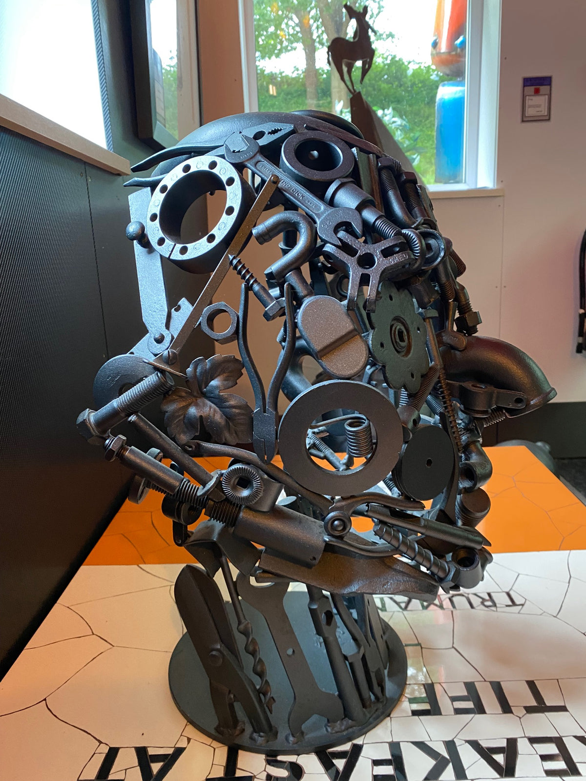 An unusual, contemporary sculpture of a head made from a mixture of knuts, bolts and small tools from the sculptor's studio.