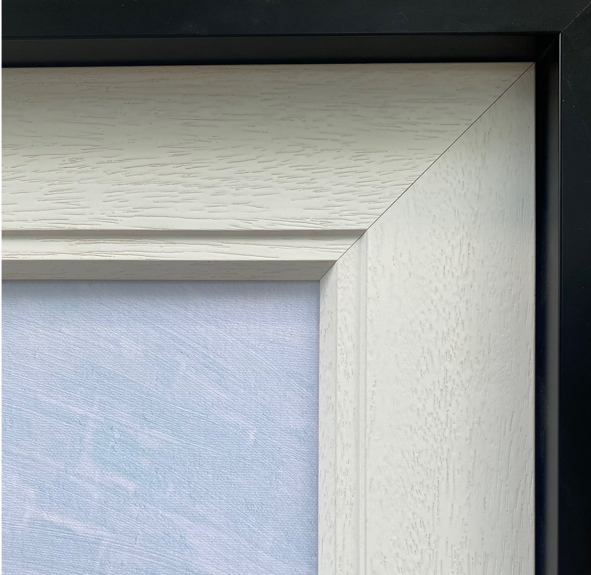 Double framed with a contemporary inner off-white slip and outer narrow matte black moulding.