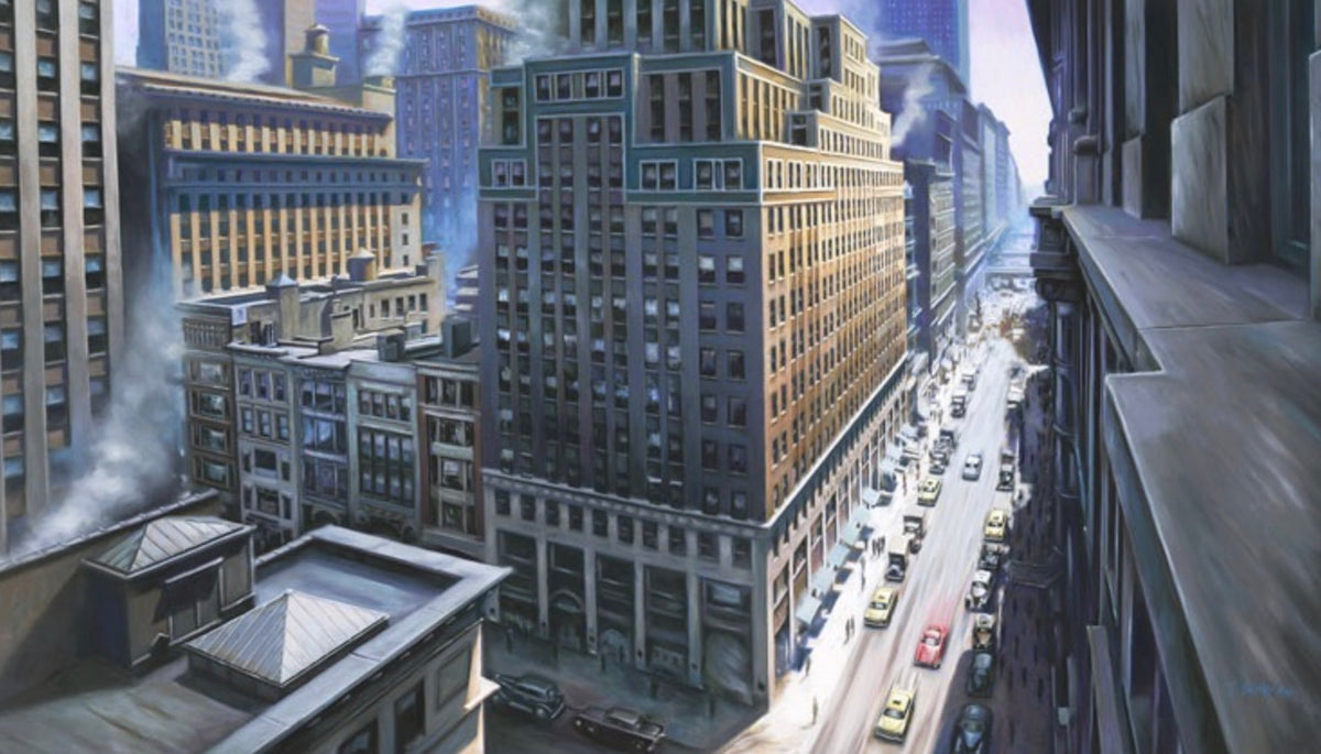 A print taken from James' original painting from his New York cityscape series which explore hair-raising viewpoints and unusual perspectives with the ubiquitous red Ferrari.