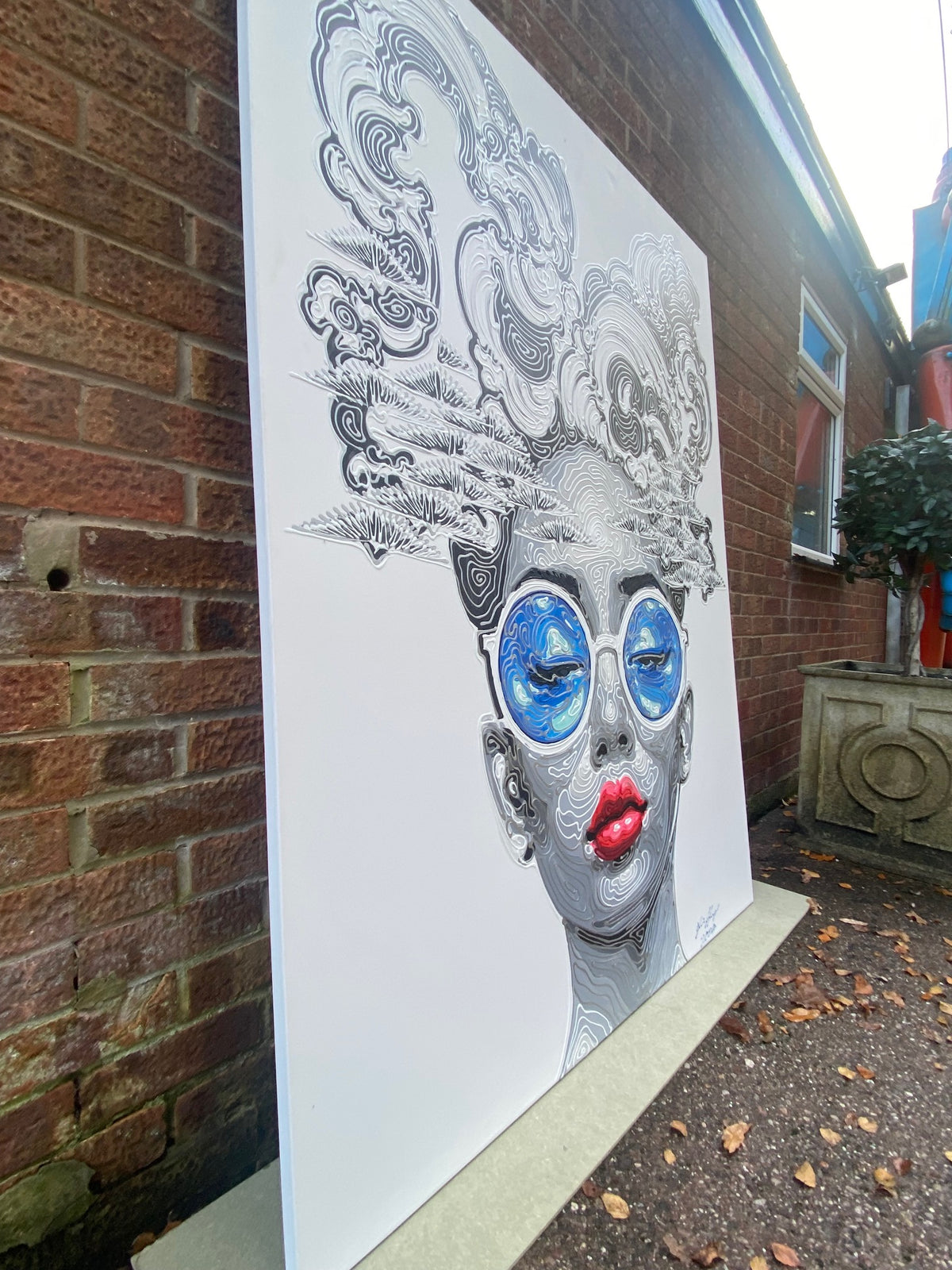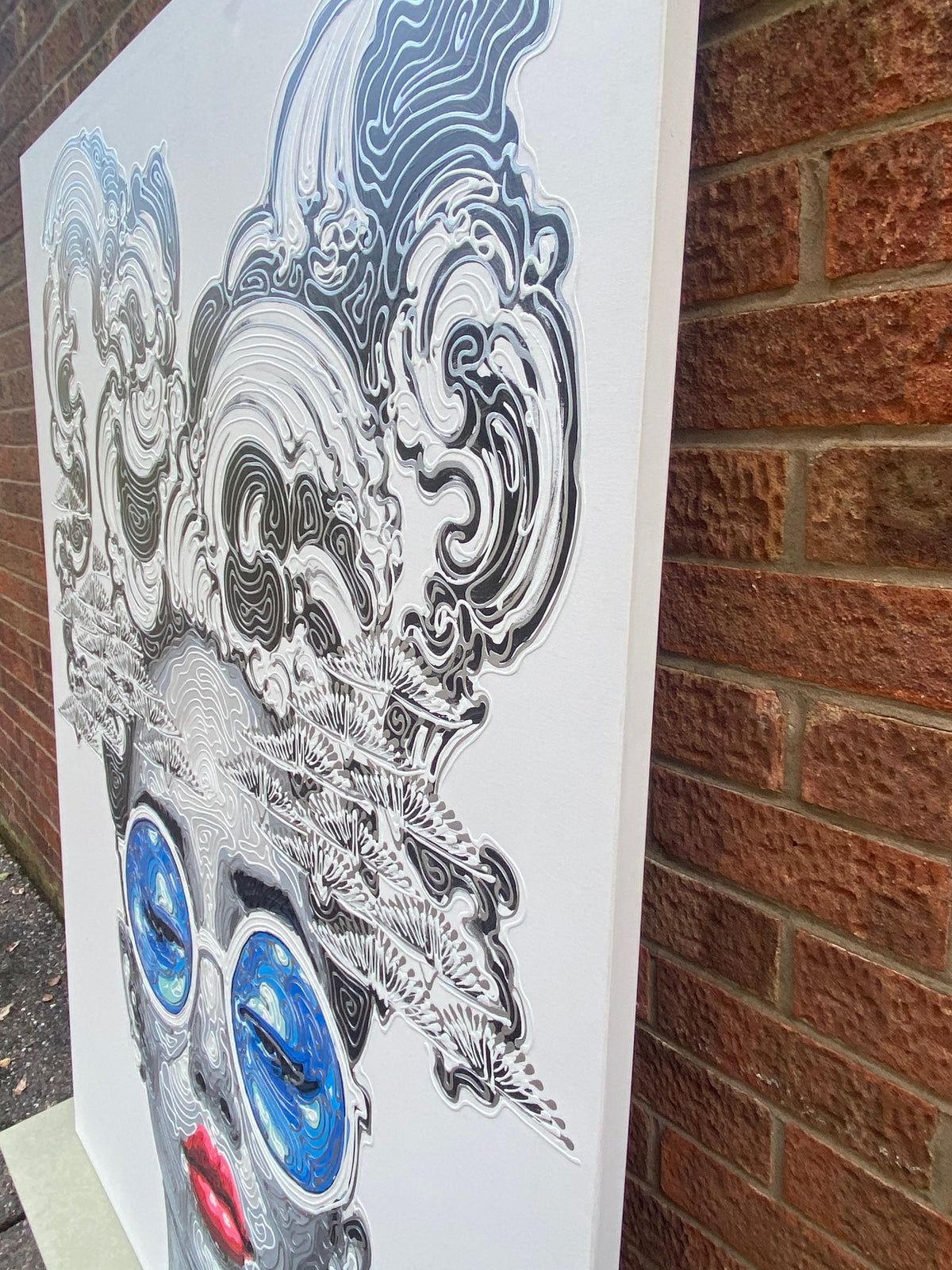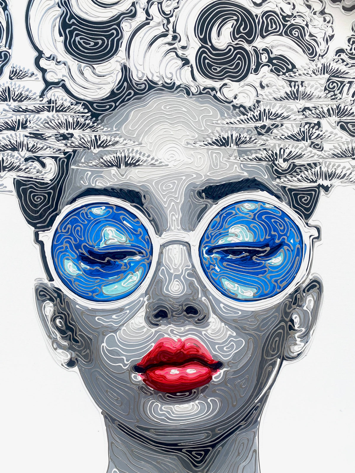 A striking, large-scale captivating contemporary portrait which demonstrates Chaiyapong's signature technique of applying a continuous line of paint in the form of contour lines to build structure with intertwining decorative East Asian motifs. With quirky colourful, sunglasses, this painting emanates that balmy, summer feel.