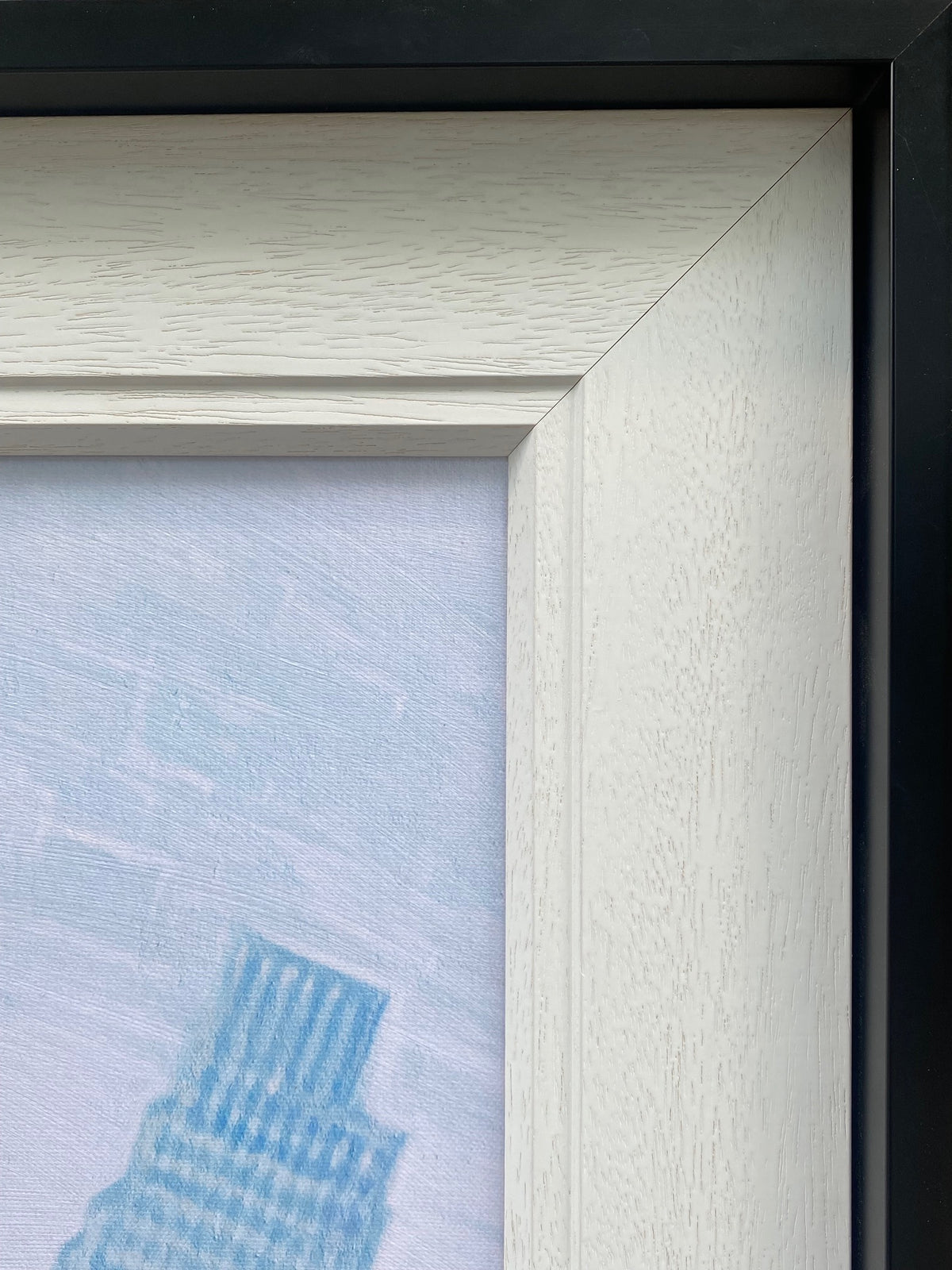 Double framed with a contemporary inner off-white slip and outer narrow matte black moulding.