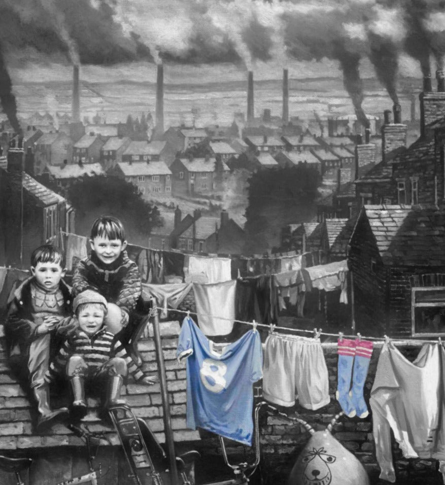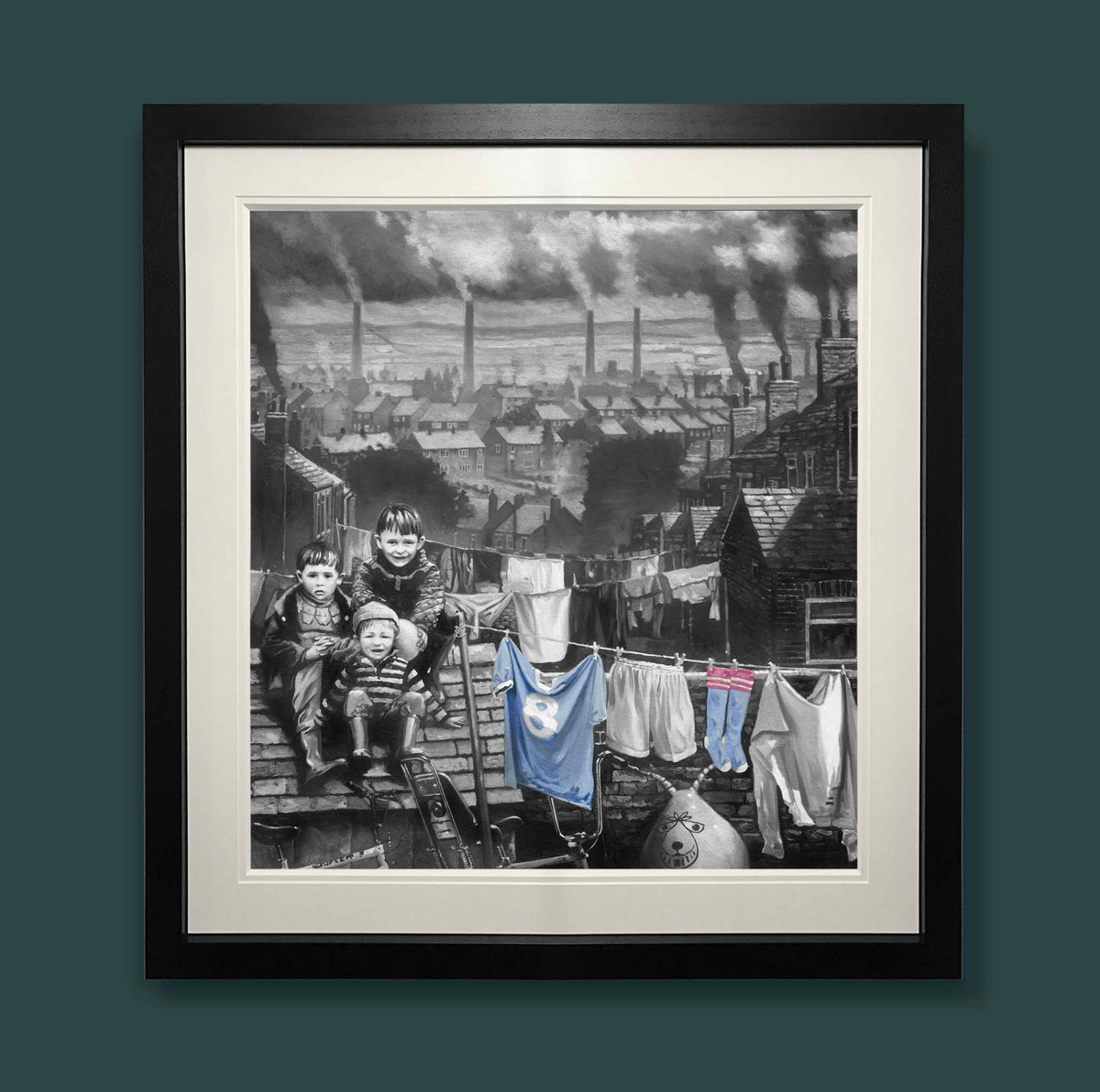 Originally painted as a commission for a client featuring three brothers and a reference to their favourite Manchester city player Colin Bell, it coincided with James' northern industrial series and was turned into a limited edition print.
