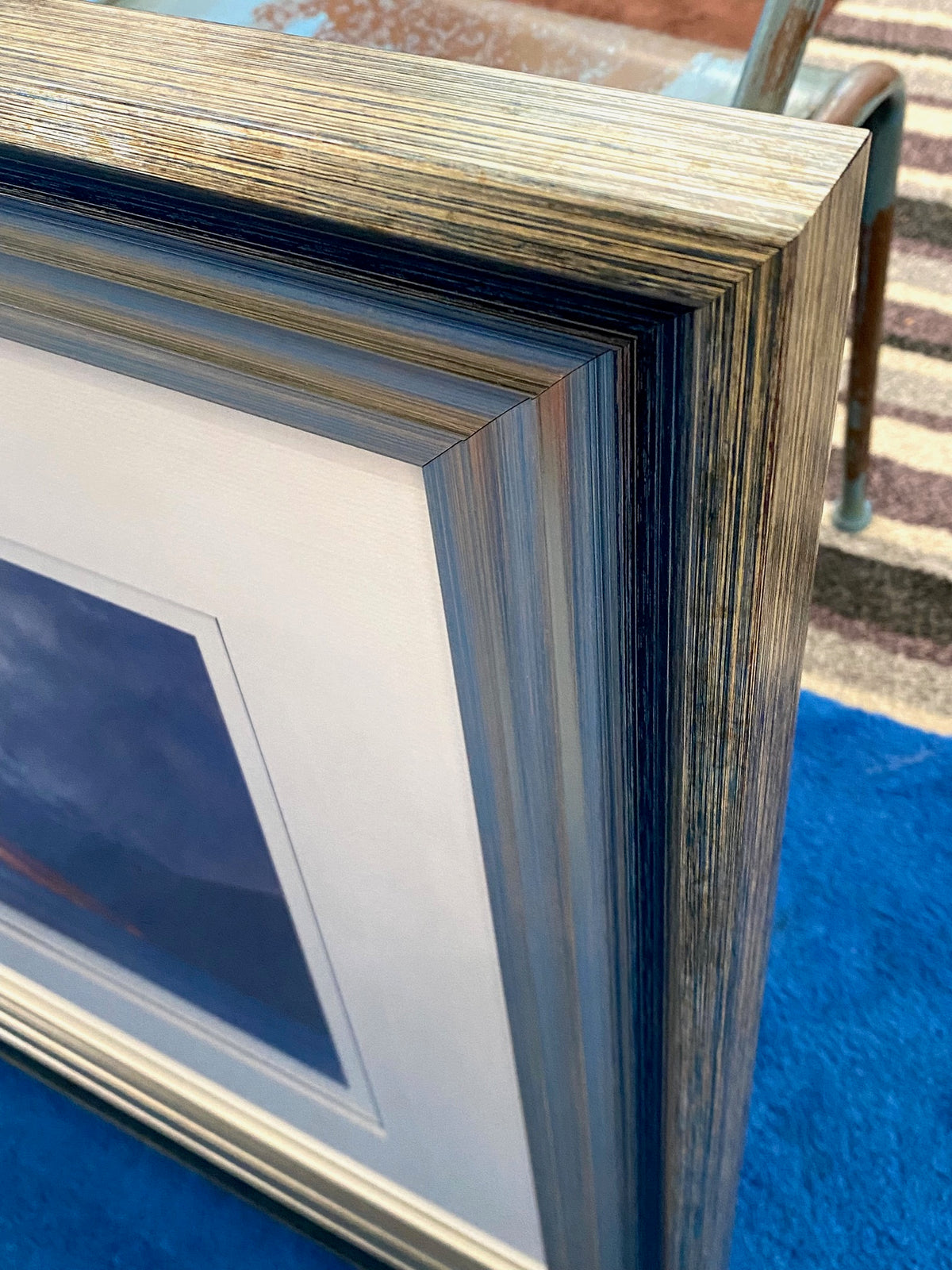 Double mounted and framed in a silver moulding which gradates to a distressed dark silver with blue tones.