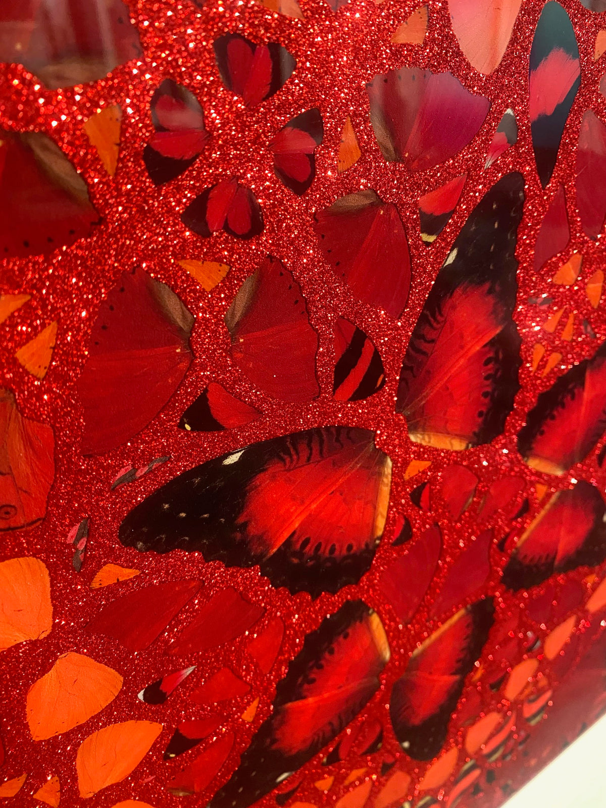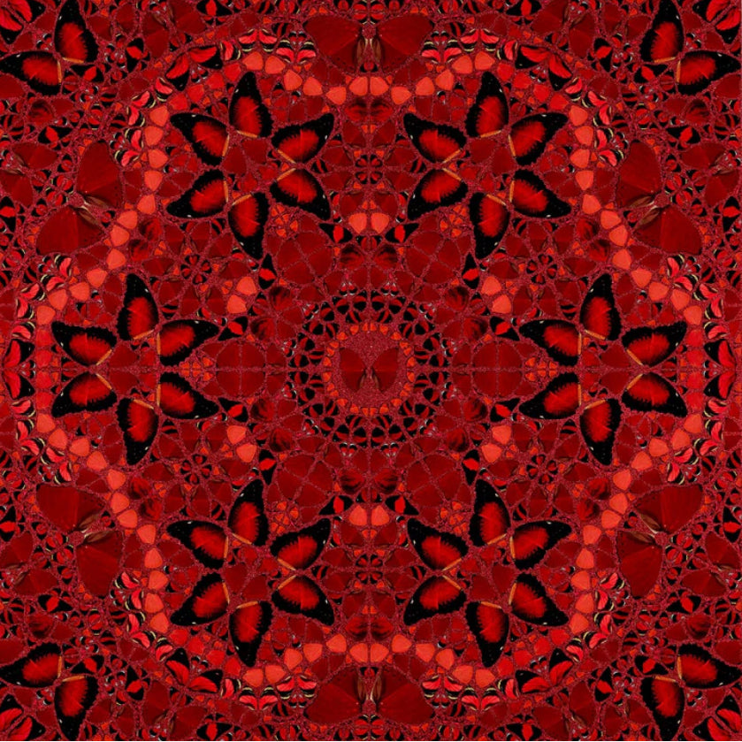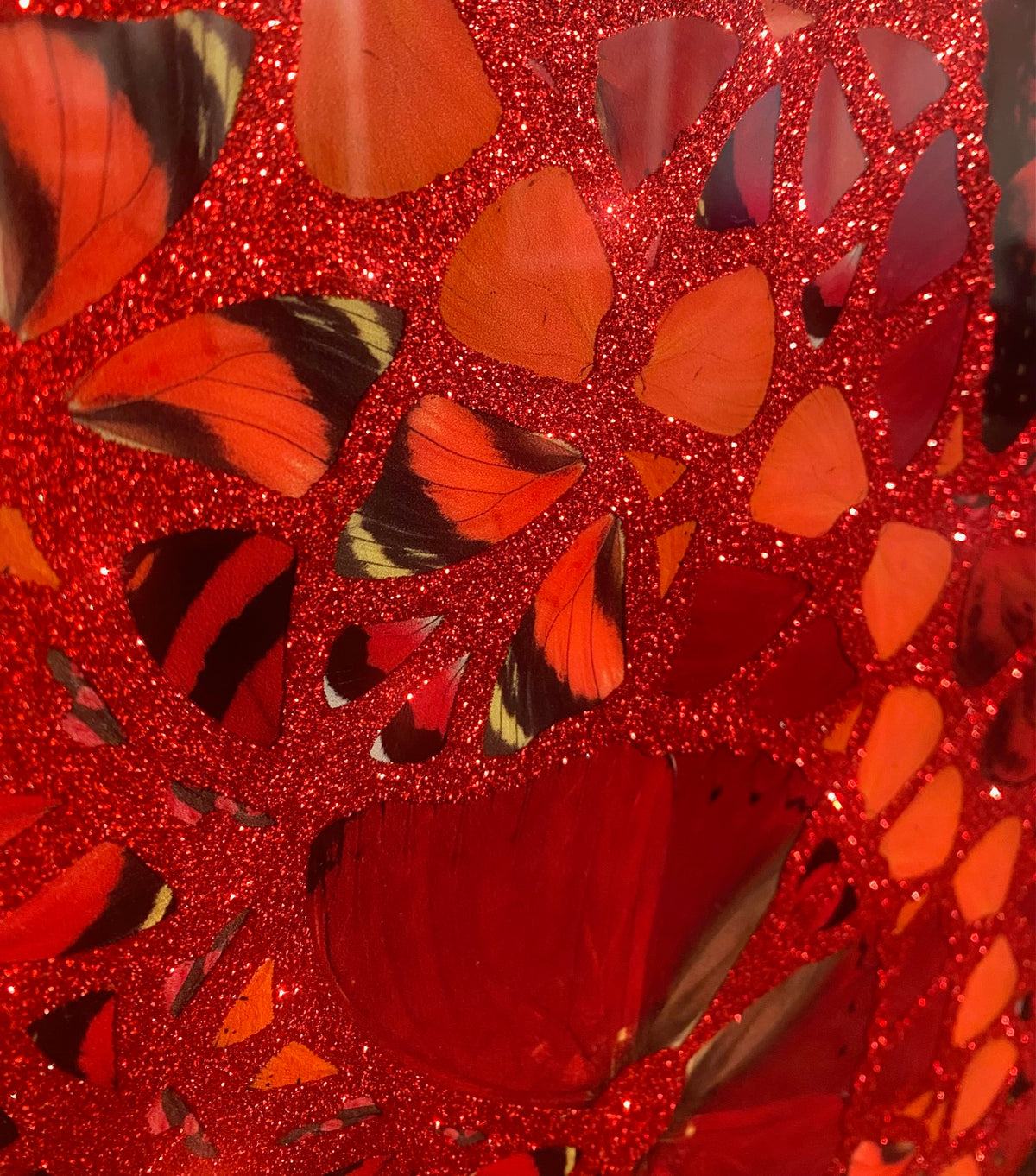 From Hirst's Empresses collection - five pieces of work based on influential historical female rulers and comprising kaleidoscope-like patterns in the form of butterfly wings. Wu Zetian's butterflies form a symmetrical hexagonal formation with the light-reflecting surface and vibrant glitter creating a tangible piece of art alluding to a sense of energy and movement.