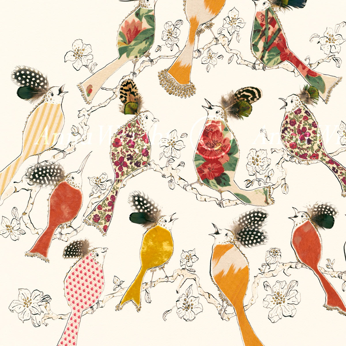 A delightful playful depiction of those familiar garden birds perched in nearby trees during the dawn chorus.