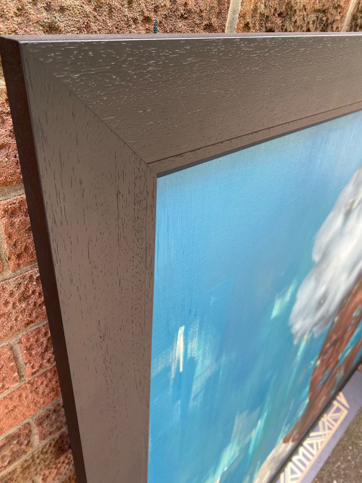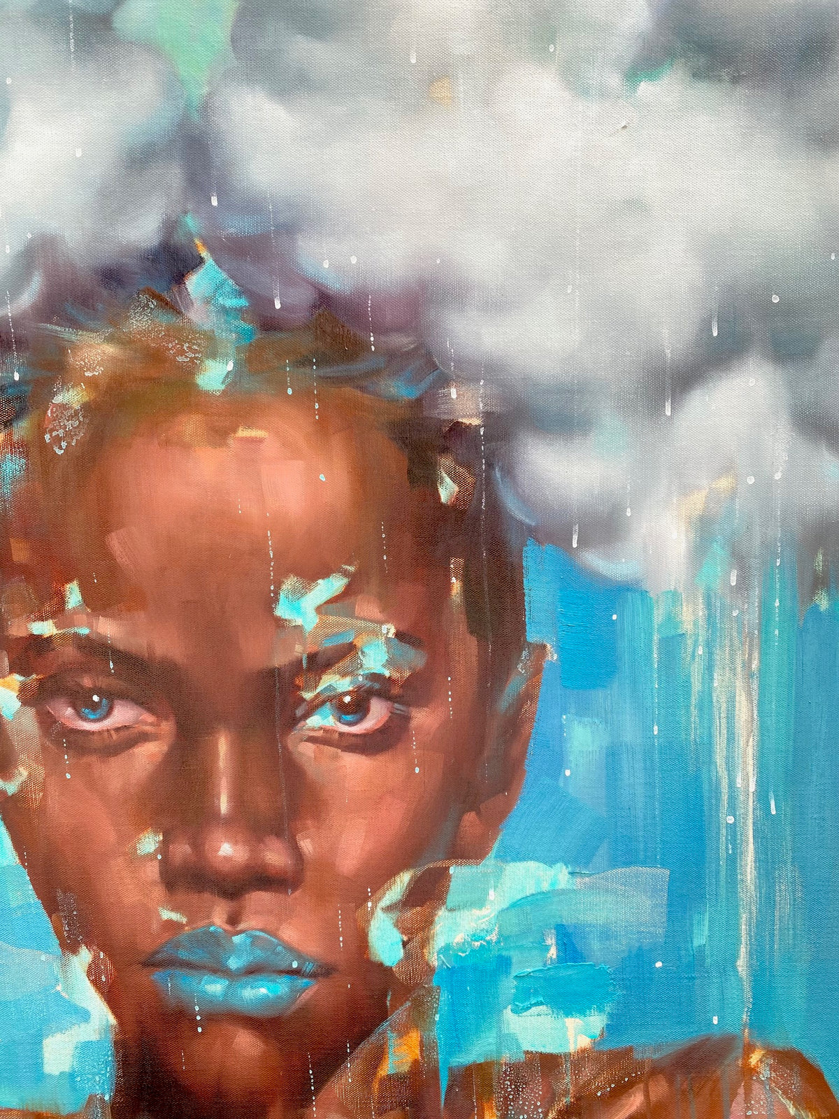 A powerful portrait showing the artist's signature approach to composition, incorporating expressive brushwork, blocks of colour and areas of pattern with a hint of surrealism as her hair morphs into clouds.