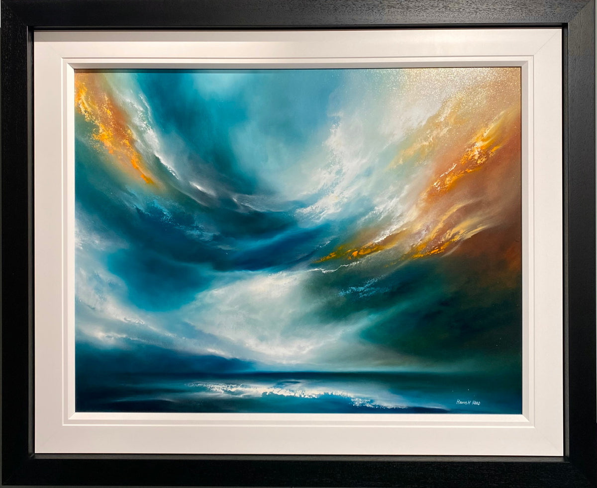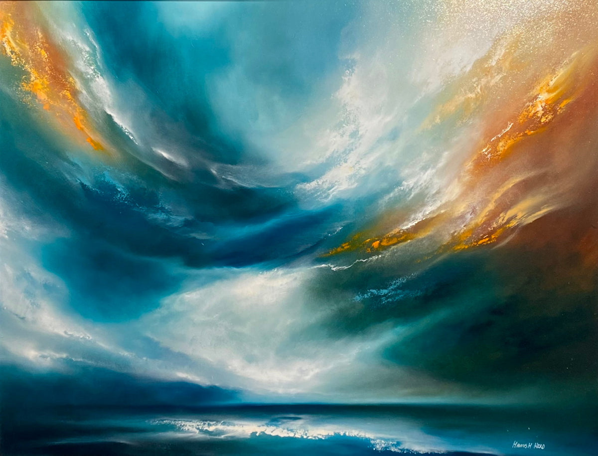 A seascape with a tumultuous sky at the end of a storm with shades of turquoise and a contrasting fiery orange palette.