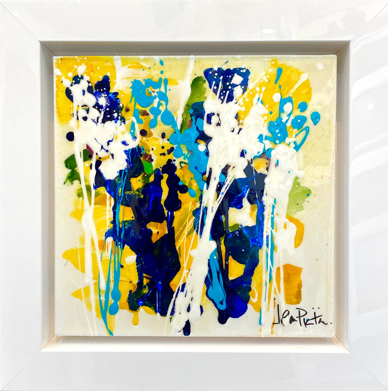 Her latest works are the result of this thinking. She has taken the abstract form to a larger scale, intensified the colours by adding a resin finish, thus improving the “movement” within the work.