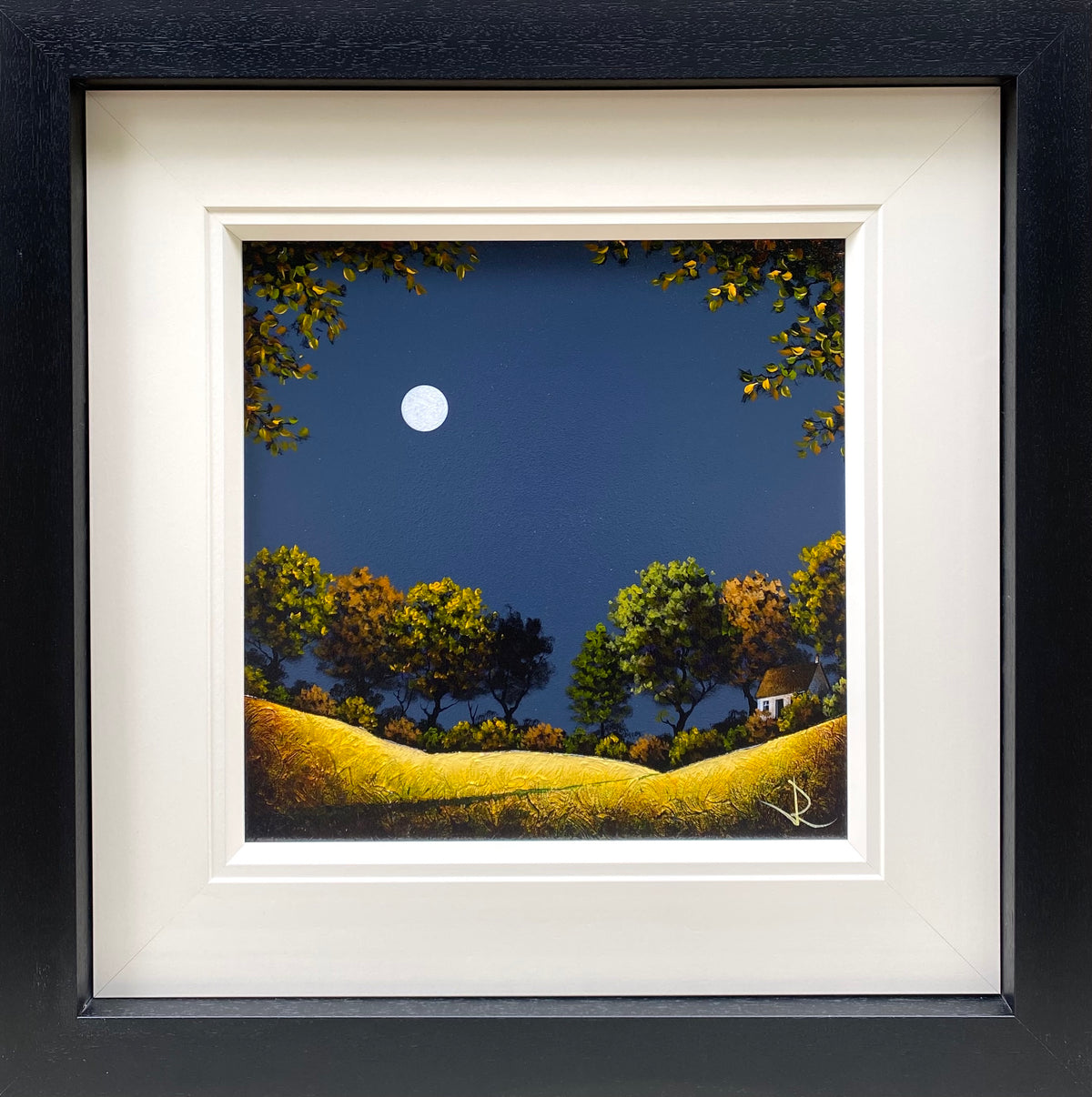A peaceful retreat with a comforting warm glow, this painting demonstrates the artist's signature moonlit sky with a minimal colour palette but with striking strong contrasts of dark and light.