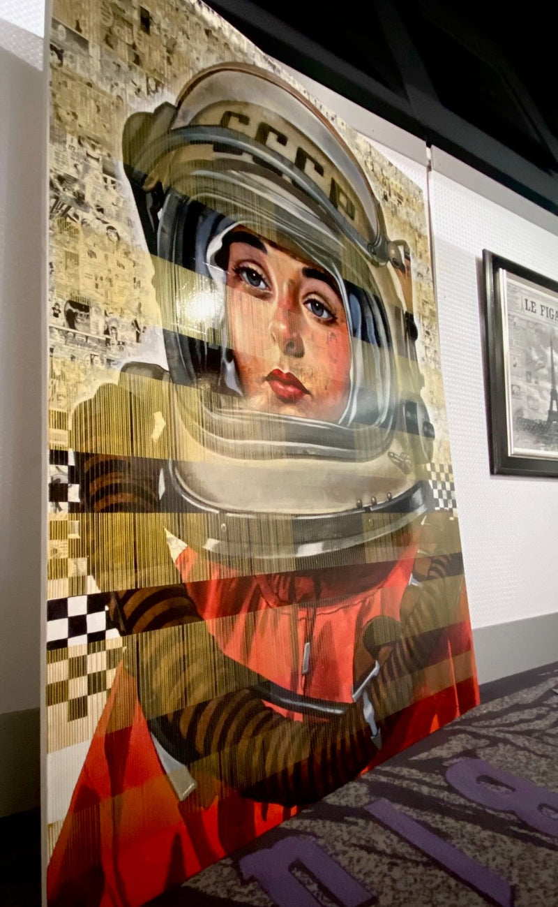 The boldness and vibrancy of colour instantly draws the eye to his paintings but equally appealing is the subject matter presented and the method in which these paintings are composed. Puritat binds both eastern and western cultures, drawing upon influences such as monumental buddhist sculpture, urban street art murals, Japanese Manga, Silver Age comics and female subjects from a wide range of cultural backgrounds. The artist’s signature style is created by collaging comic book pages onto the canvas upon which he then paints a portrait and finishes with a screen-printed layer of linear pattern.