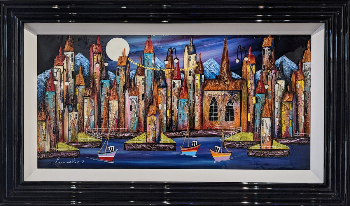 A quirky, vibrant harbour scene with a full moon lighting the mountain backdrop behind the colourful coastal buildings at night. Rozanne applies her signature textured palette-knife work and finishes with a resin glaze.