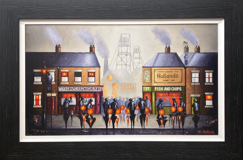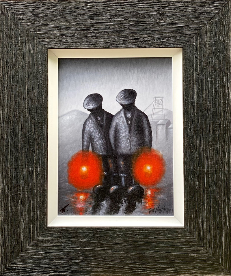 The Northerner’s style of harsh, dark tones, almost appearing like the painting has been created using materials from the mined earth, is juxtaposed with bright, contrasting areas which are also reflective of the industry itself. A unique, distinct style of stylised people and a simplicity in representing the buildings and industrial structures, The Northerner adds strong contrasts, textures and narrative to each piece.