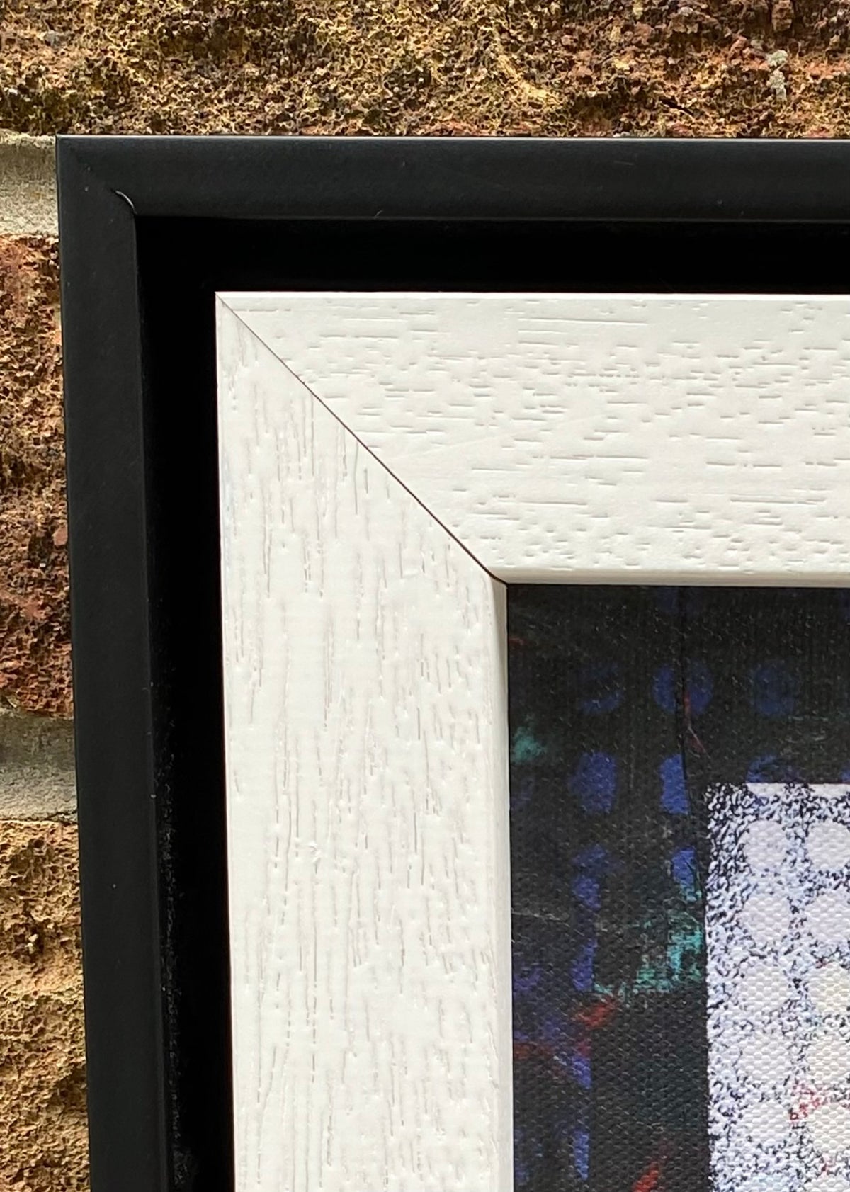 Double framed with an off-white inner woodgrain and floated in a contemporary matt black outer moulding.