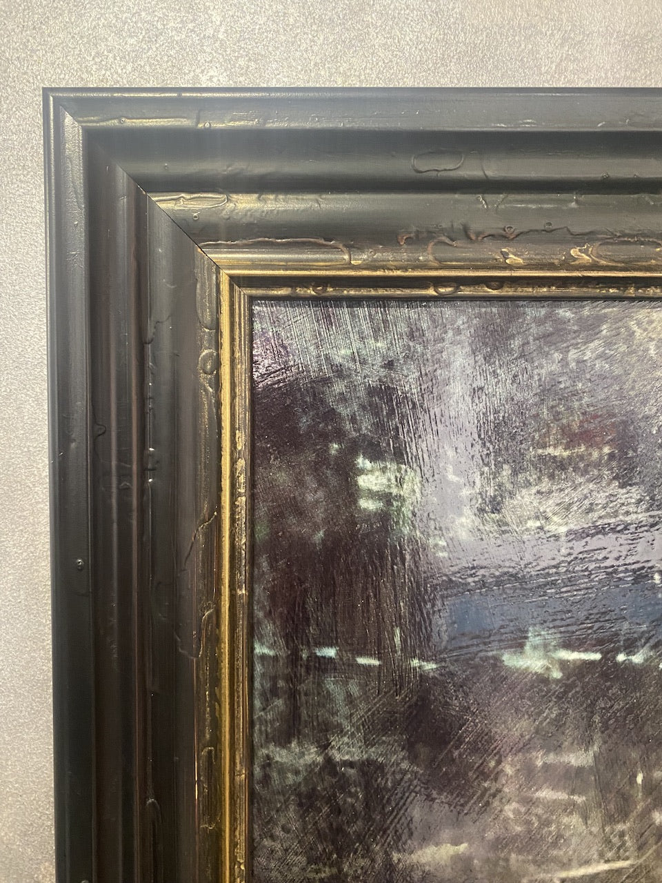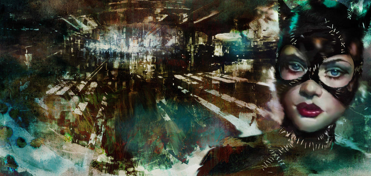 One of a series of paintings based on the character Catwoman. The scene depicts a subterranean area with watery textures, shadows and a character from the underworld.